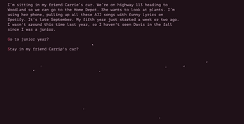 "In My Friend Carrie's Car" is an autobiographical text-based game. While driving one town over to buy some plants with a friend, you find yourself thinking back on some things that have happened over the last few years.